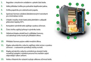 Bezpečnost zajišťuje integrovaná dochlazovací smyčka proti přehřátí a promyšlený systém odvodu spalin při přikládání. Kotel je zároveň navržen pro jednoduchou obsluhu i údržbu.